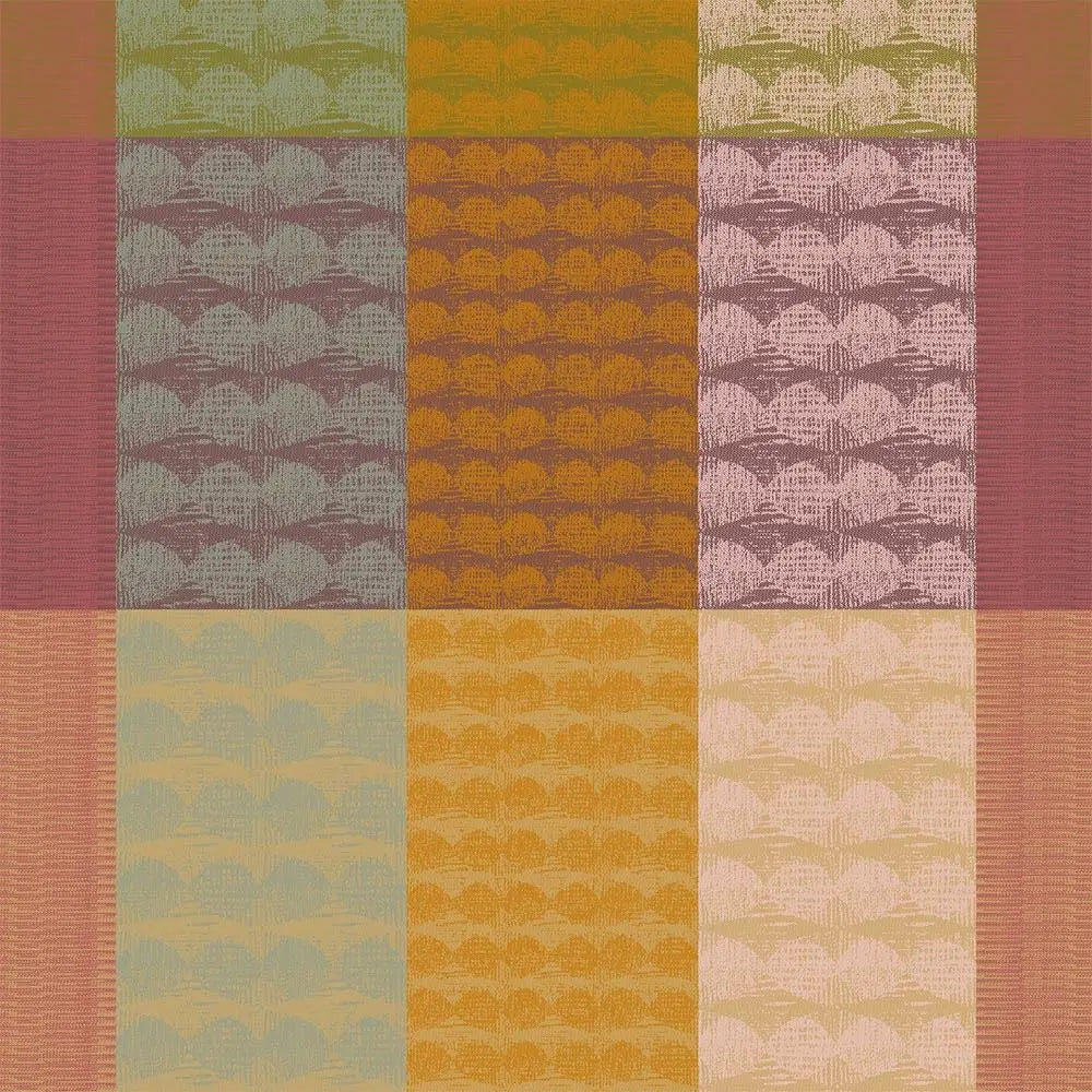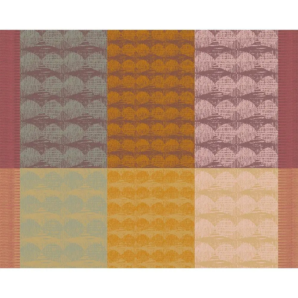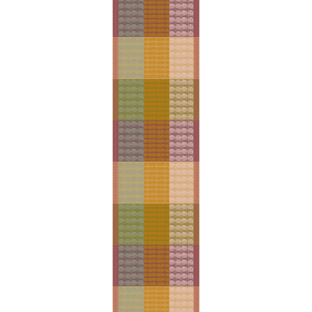 Table and kitchen linens showcasing a contemporary French design with jewel-toned circles and stripes.