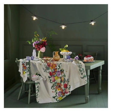 Garnier-Thiebaut's Envies D'Automne Flamboyant Tablecloth is a classic blend of 50% cotton and 50% linen. This tablecloth features a vibrant large-format floral design in shades of red, yellow, orange, purple, and pink against an ivory white background. Perfect for any season, this printed, pre-washed tablecloth pairs beautifully with seasonal greens and flowers for a stunning centerpiece.