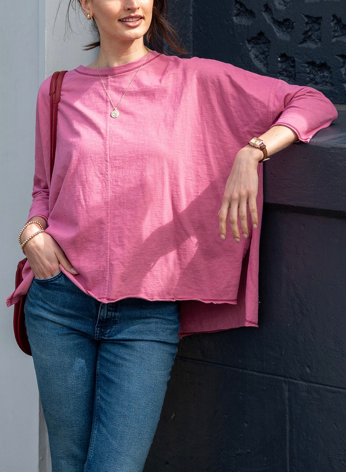 - Stitches only: Pops of contrast stitching at neck, cuffs and hem + raw edge finishing