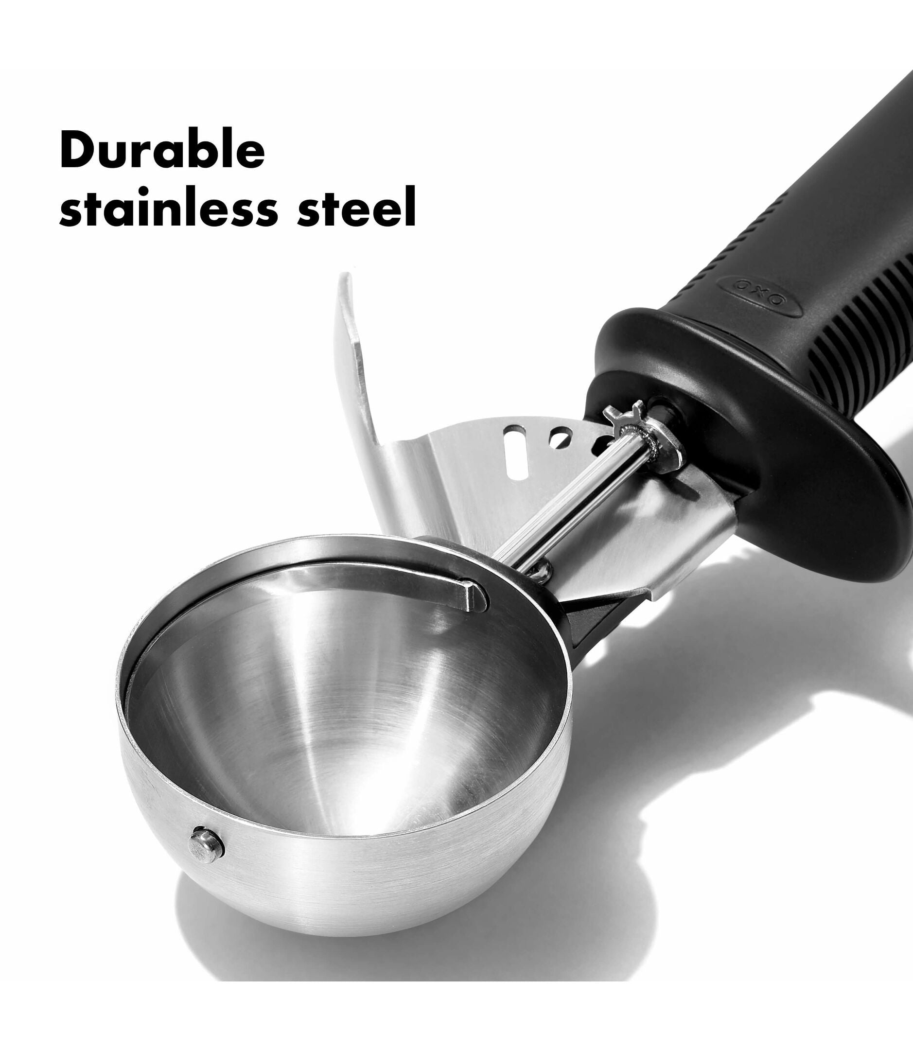 The OXO Good Grips Classic Ice Cream Scoop lets you dish up cone after cone like a soda fountain pro. It’s designed with a pop-up lever that releases scoops of ice cream, sorbet and sherbet with a simple press. The handle features a soft, non-slip grip that absorbs pressure to minimize effort even when scooping hard ice cream. This Scoop is constructed with durable stainless steel that won’t chip, pit or rust, and it’s dishwasher safe.