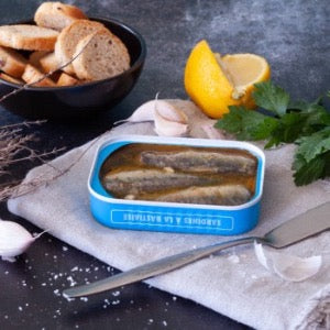 Ingredients: Sardines (Sardina pilchardus) 70%, extra virgin olive oil, lemon 2%, garlic 1.5%, salt, parsley 0.5%.