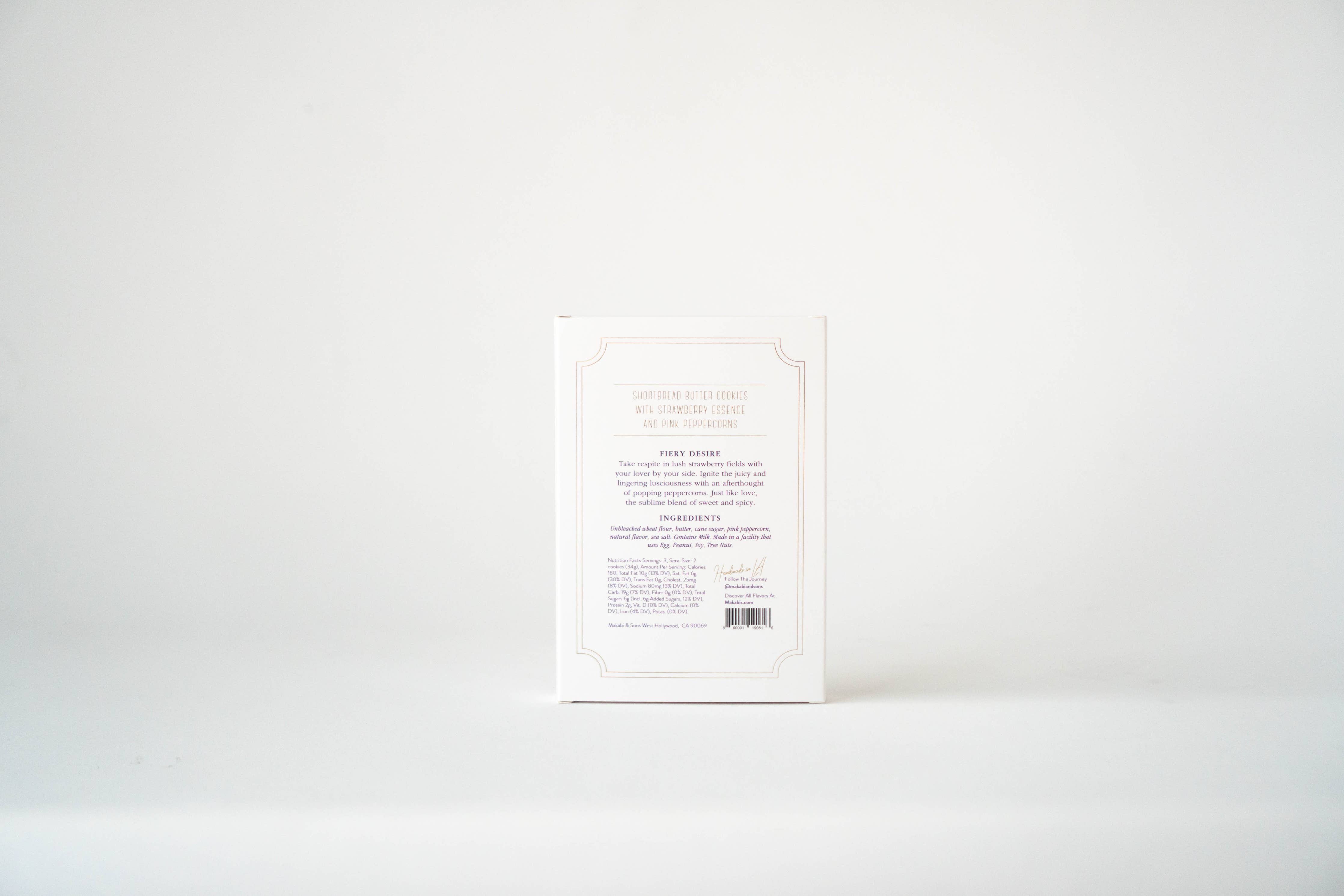 Specialty Valentine's Day shortbread butter cookies with strawberry essence and pink peppercorns. Ingredients: Unbleached wheat flour, butter, cane sugar, pink peppercorn, natural strawberry flavor, salt. Take respite in lush strawberry fields with your lover by your side. Ignite the juicy and lingering lusciousness with an afterthought of popping peppercorns. Just like love, the sublime blend of sweet and spicy. 3.6oz (6 cookies per box)