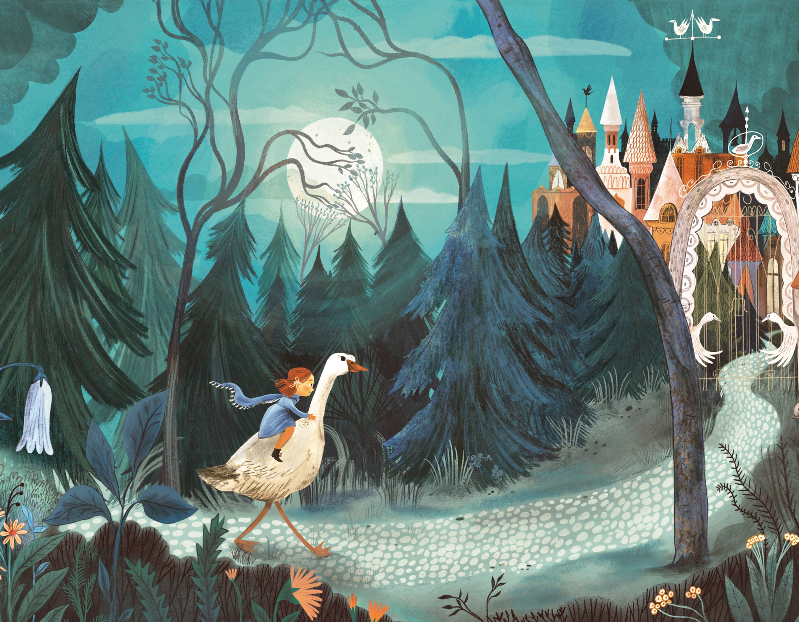 Embark on a whimsical journey with On An Adventure, a 100 piece mini puzzle by artist, Adelina Lirius. This enchanting scene captures a young girl riding an oversized goose through an enchanted forest, illuminated by the light of the full moon. Beyond the trees, a magical city glimmers behind an ornate gate adorned with more magical birds. Piece together this wonderful mini puzzle that illustrates a world of wonder and magic.