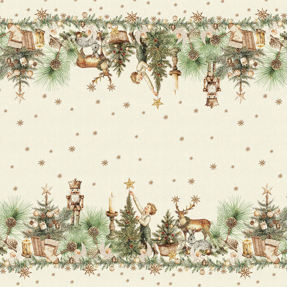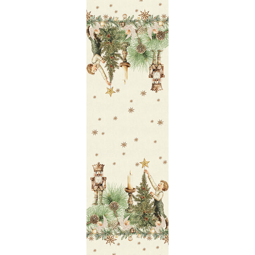 French table linen adorned with cherubic children decorating a Christmas tree. This vintage-inspired fabric is embellished with nutcrackers, garlands, stars, and pinecones, creating a classic holiday ambiance.