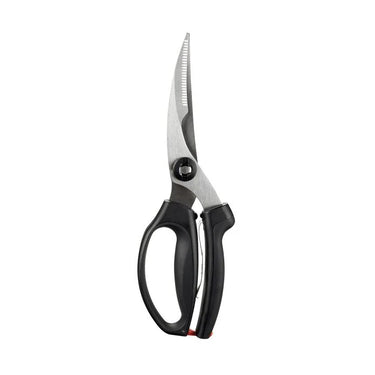 Oxo's Poultry Shears are ideal for trimming and cutting poultry, with sharp stainless steel blades that are curved and tapered for precision. Blade notch secures bones, and handle loop and bolster prevent your hand from slipping forward while cutting. Handle lock keeps blades closed for safe storage.