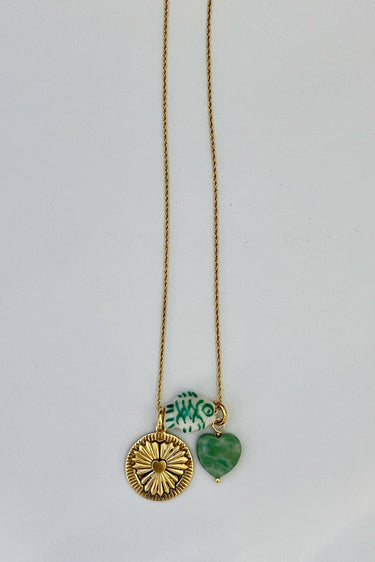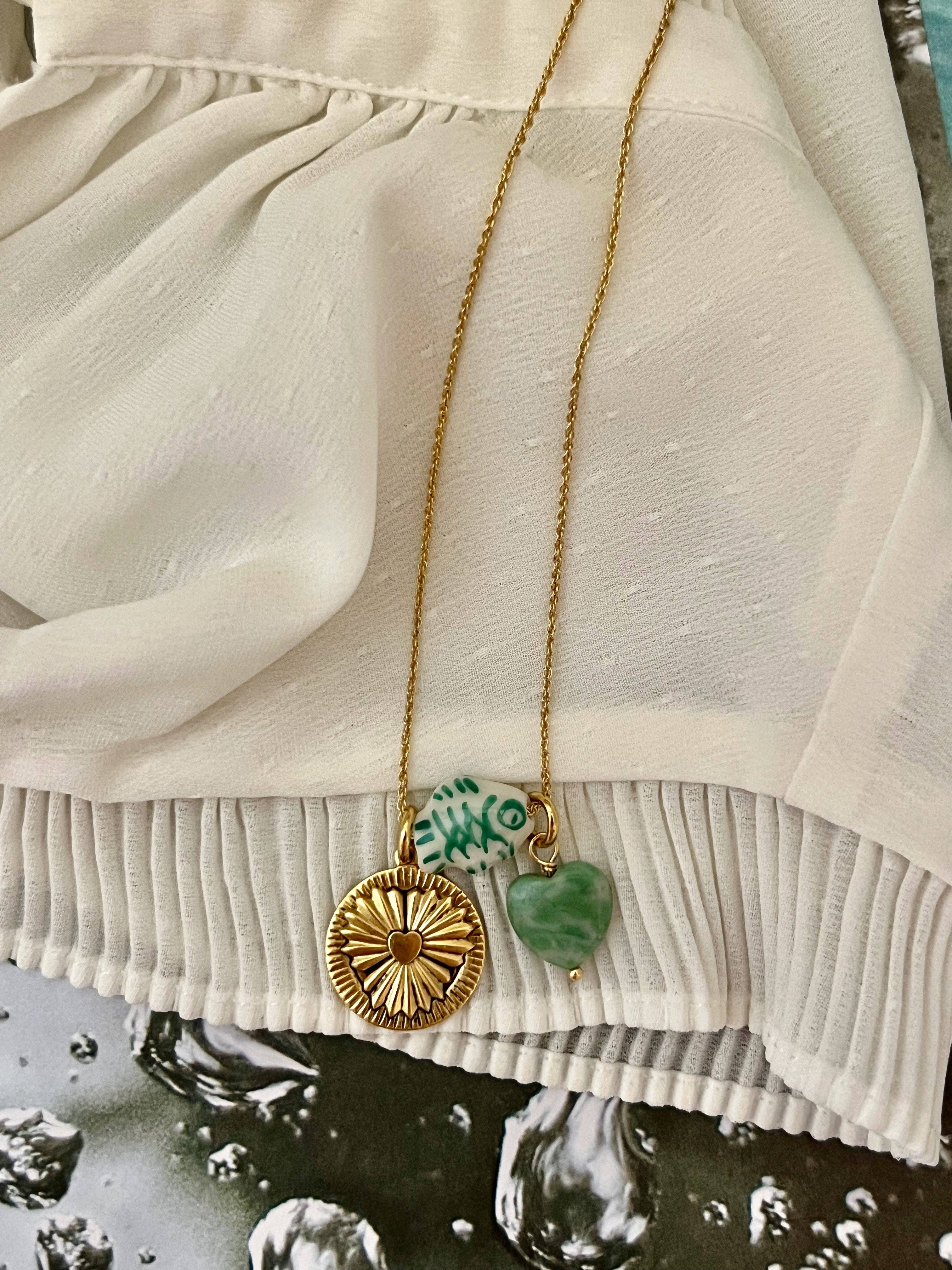 A key piece in the Sandrine France Studio collection, this necklace artfully combines meaningful charms inspired by a love for the ocean. It features a Jade-Zing Jiang heart paired with a porcelain fish, all set in gold-plated brass.
