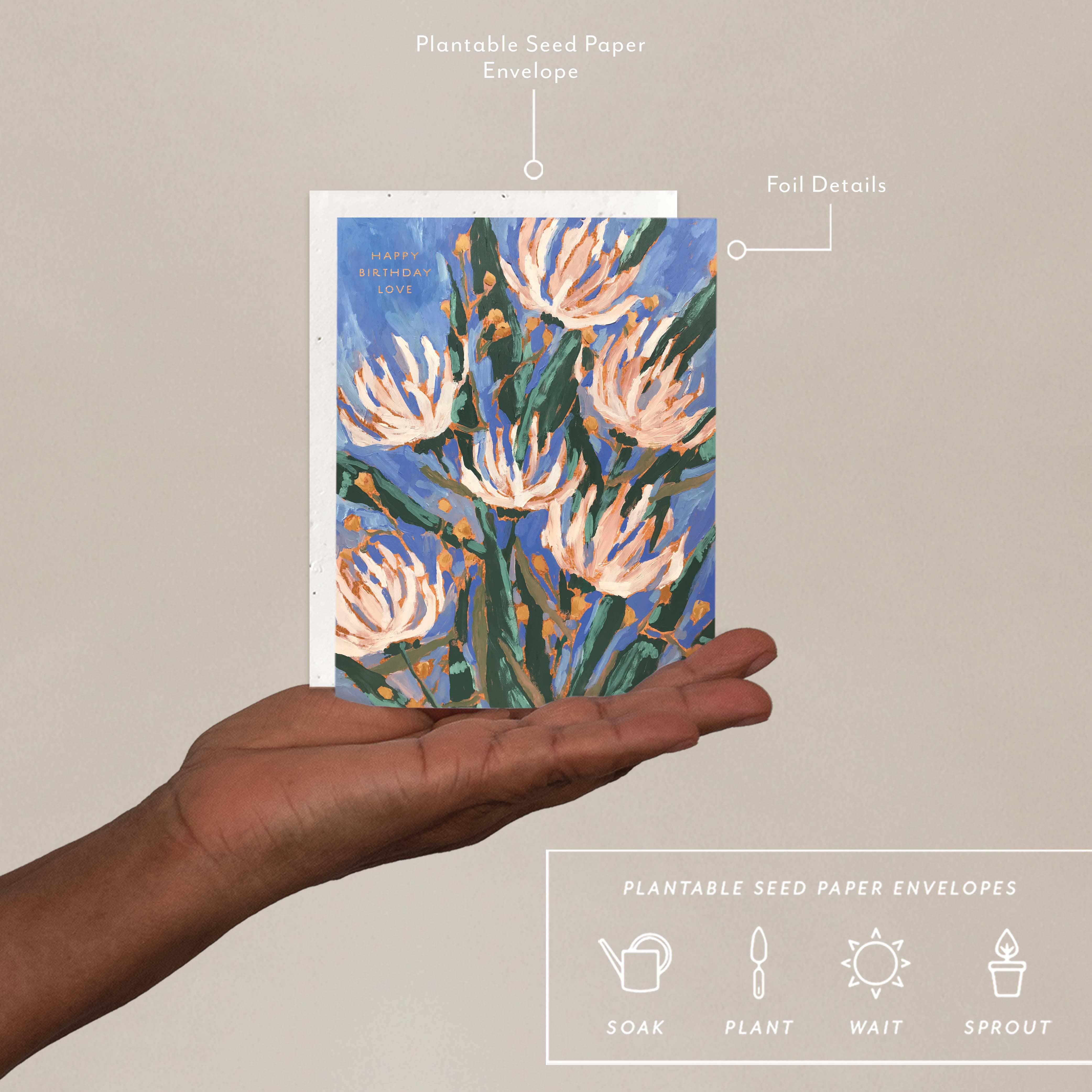 All Seedlings greeting cards have a PLANTABLE seed paper envelope which is embedded with non-invasive wildflower seeds. This seed paper is made of a biodegradable eco-paper created with post-consumer materials - no trees harmed for this paper! When planted, the envelopes compost away leaving only flowers behind.