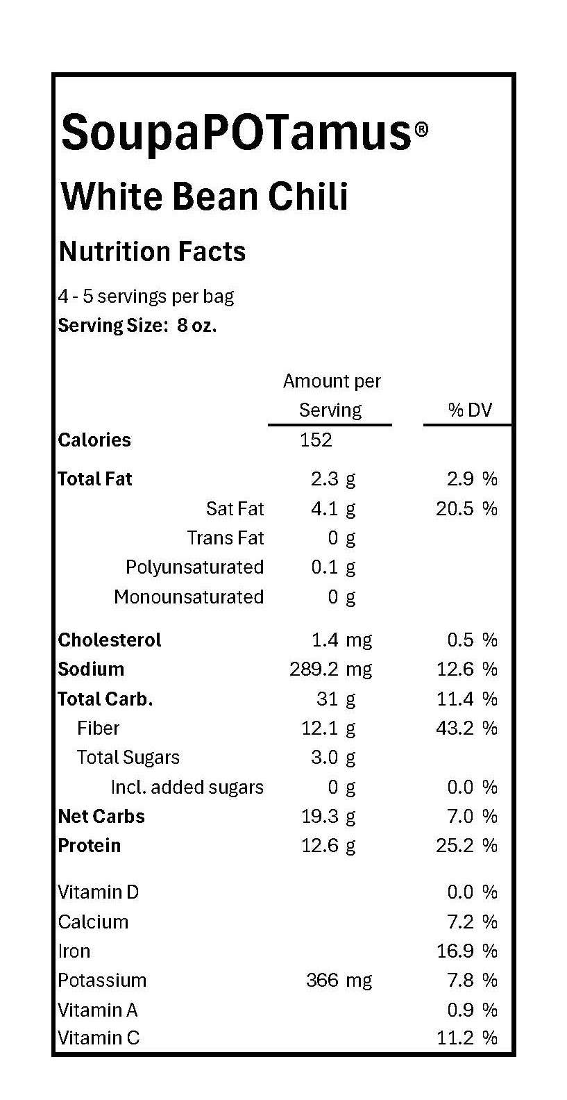 Soupapotamus White Bean Chili Dehydrated Soup is a comforting and convenient meal bursting with hearty white beans, robust spices, and a medley of wholesome farm ingredients.