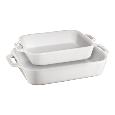 Cook for a smaller group or for a crowd with this nesting set featuring 2 rectangular dishes measuring 7.5 x 6-inches and 10.5 x 7.5-inches. STAUB rectangular baking dishes gently retain heat and won't absorb moisture, producing a delicious result for all your favorite recipes. The comfortable, large handles make maneuvering hot dishes easy. Ideal for lasagna, casseroles, and desserts, as well as roasted meats and vegetables, these bakers are essential dishes in the kitchen.