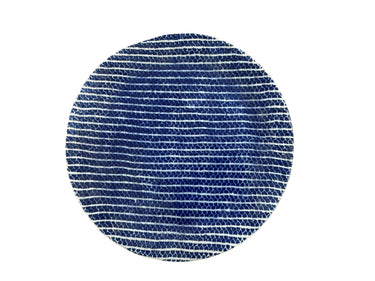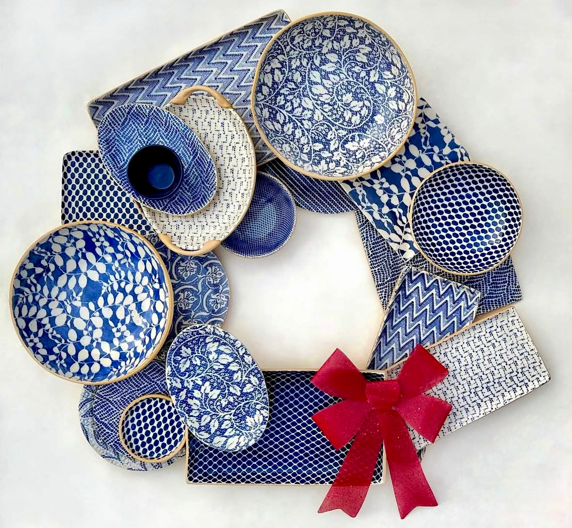 Patterns are created by painting through textiles and lace using liquid porcelain to produce a distinctive "one of a kind" result. The base of warm, natural stoneware juxtaposed with vibrantly colored and patterned porcelain surfaces achieves the casual yet sophisticated look that has become her signature in both dinnerware and accessories.
