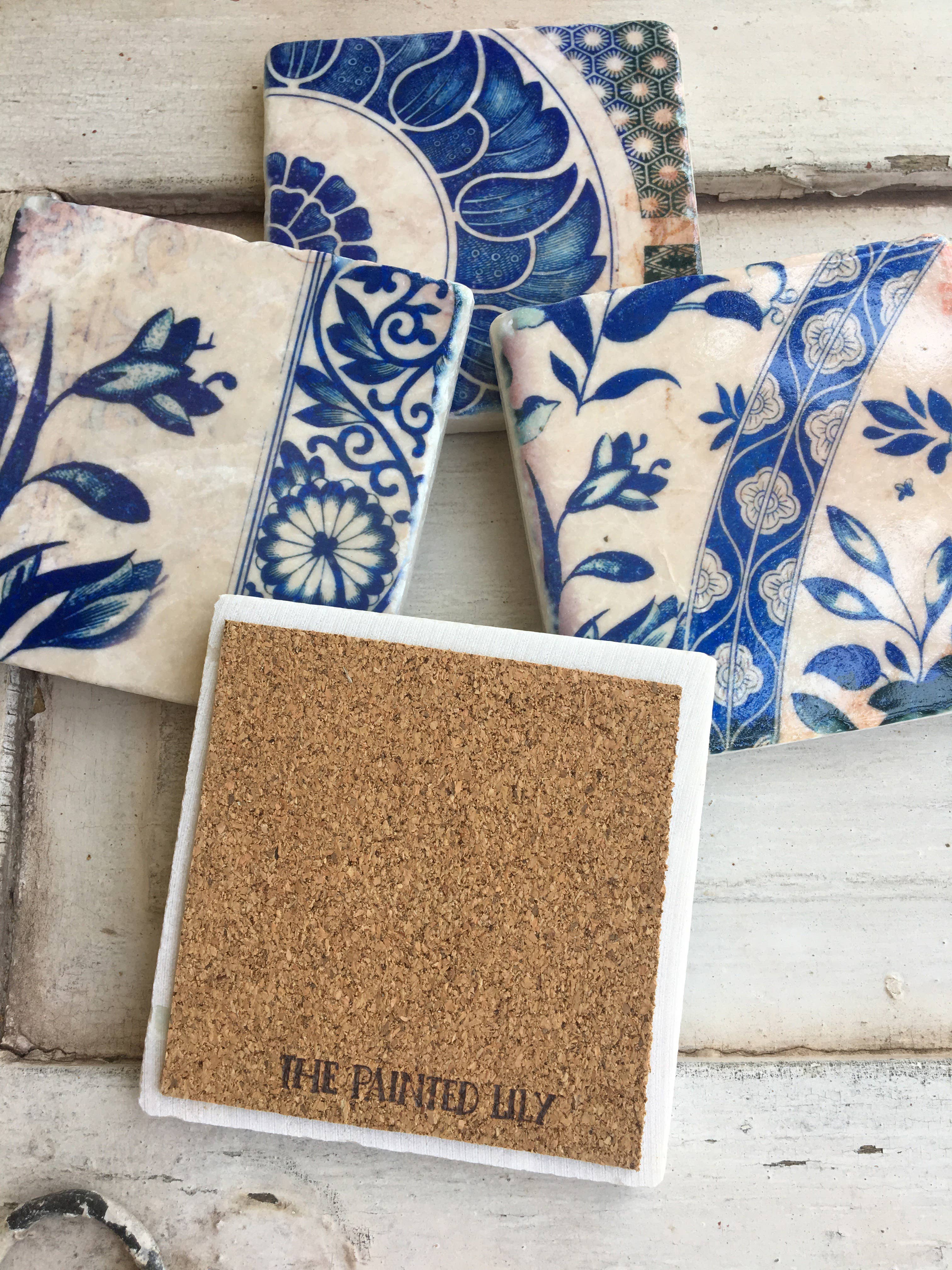 The In Blue stone coasters are made using tumbled marble tile and antique delft tile images. Made to last a lifetime, these coasters are incredibly durable and good for use with hot and cold beverages.