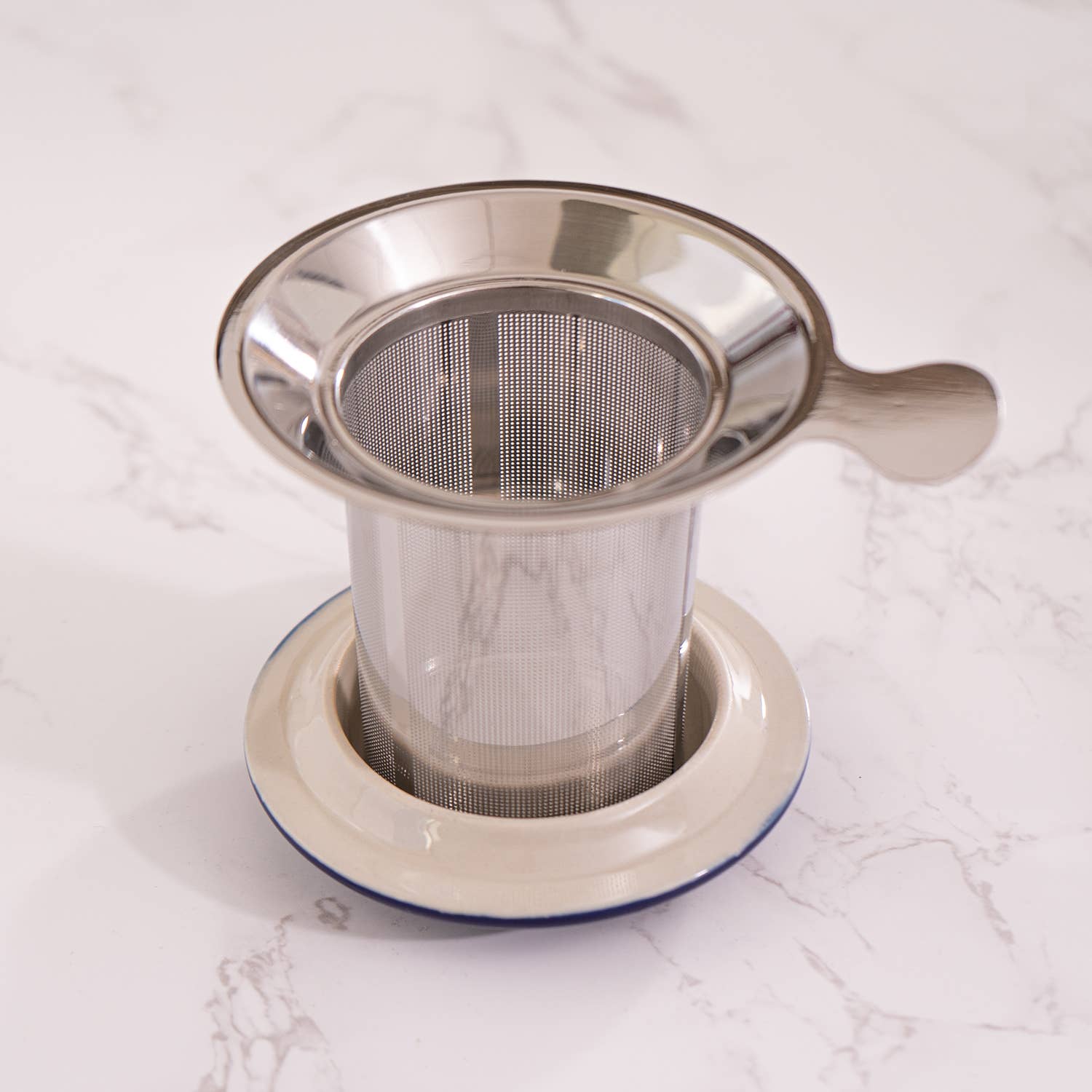 Dimensions: 3.75"W x 5"H. Made of porcelain for the mug and lid, includes a stainless steel infuser.